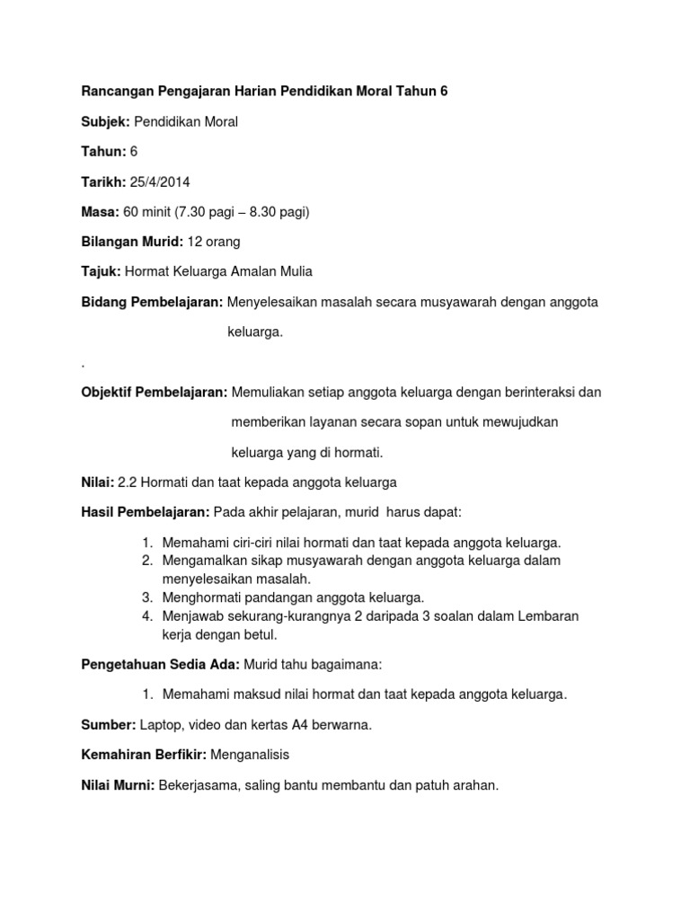 Rancangan Pengajaran Harian Pendidikan Moral Tahun 6 from imgv2-1-f.scribdassets.com Kehormatan dan kebahagiaan hidup sebuah keluarga akan terwujud jika semua anggota sikap saling menghormati dan menyayangi seperti ini harus dibiasakan mulai dari keluarga. Dalam hubungan dengan orang tua, perilaku hormat ditujukan dengan berbakti kepada orang tua. Definisi • memuliakan setiap anggota keluarga dengan berinteraksi dan memberi layanan secara sopan untuk mewujudkan keluarga yang harmoni. Cara anda dapat mengelak daripada timbulnya konflik dengan anggota keluarga. Pelindung yang melindungi dan bertanggung jawab; Hormat dan patuh kepada anggota keluarga. Pengayom bagi semua anggota keluarga; Senantiasa berbuat baik dan bersikap hormat terhadap anggota keluarga.