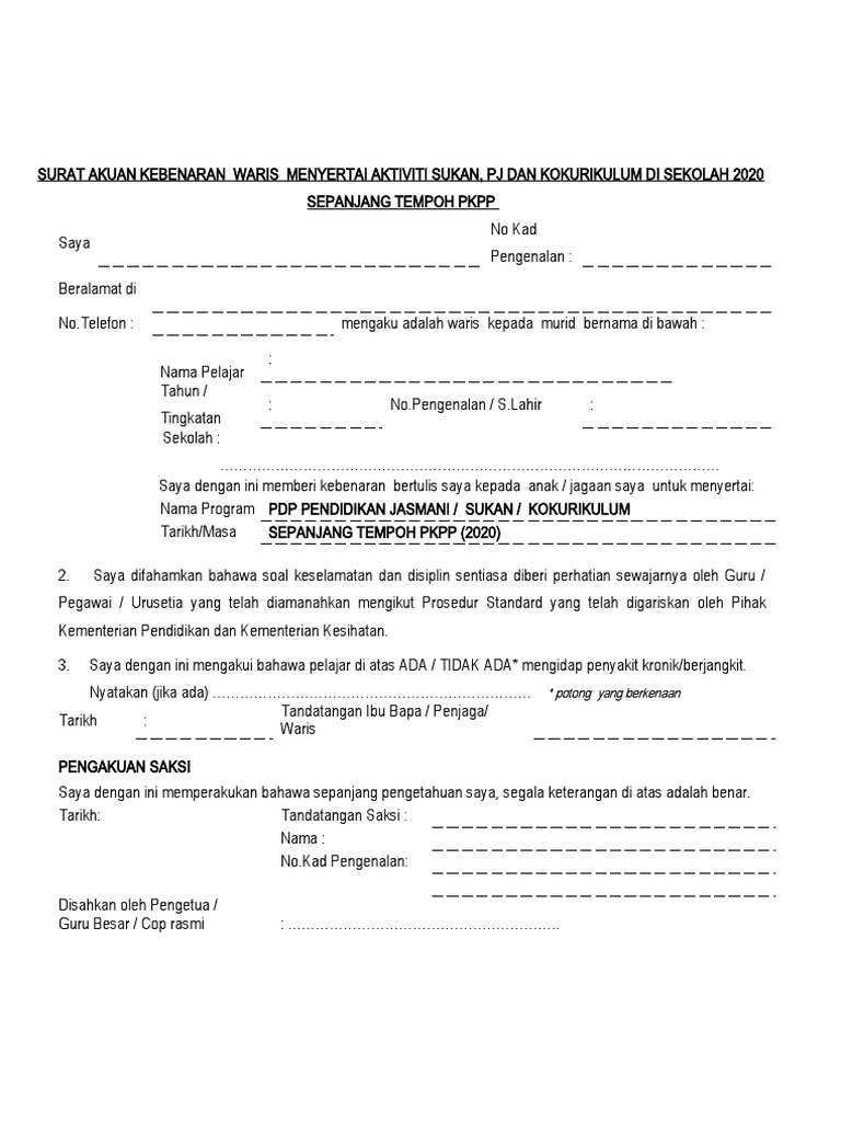 Contoh surat kebenaran kepada waris dan penjaga murid untuk menyertai aktiviti surat kebenaran sukan kokurikulum tempoh pkpp 2020.